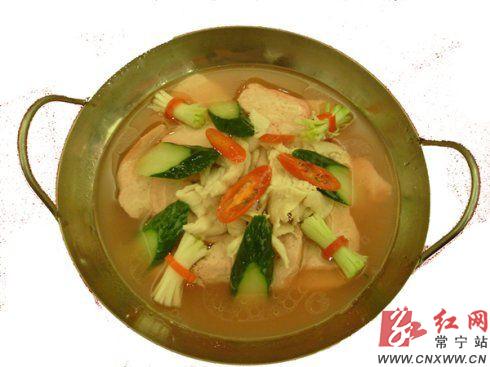 石鼓赤玉:俗名冠市红豆腐,豆腐称为琼浆。衡阳红喜事为图吉利原则上不上豆腐。衡阳大厨为改变传统习俗,在制作过程中用红曲米造色,使之充满喜庆吉祥。烹制方法采用高汤入味,促使味鲜、质嫩,加上蛇汤佐味,使之演绎成为有地方特色,老少皆宜佳肴。有诗为证:石鼓为磨,琼玉豆腐,红粉佳人,百味如故。