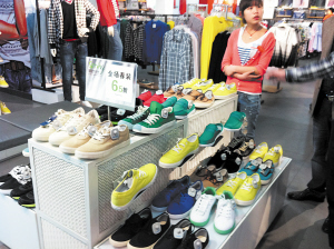 当日上午,记者随市价格监督检查局的执法人员来到步行街北入口的一家知名休闲服饰专卖店,一进门就看到在休闲鞋专区正上方摆放着“全场春装6.5折”的促销广告。专柜上30余双休闲鞋整齐摆放,除了厂家吊牌价外,找不到其他价格信息,而到底哪些鞋子属于打折范围的春款,也没有明确标识,消费者只能向促销人员口头问价。
